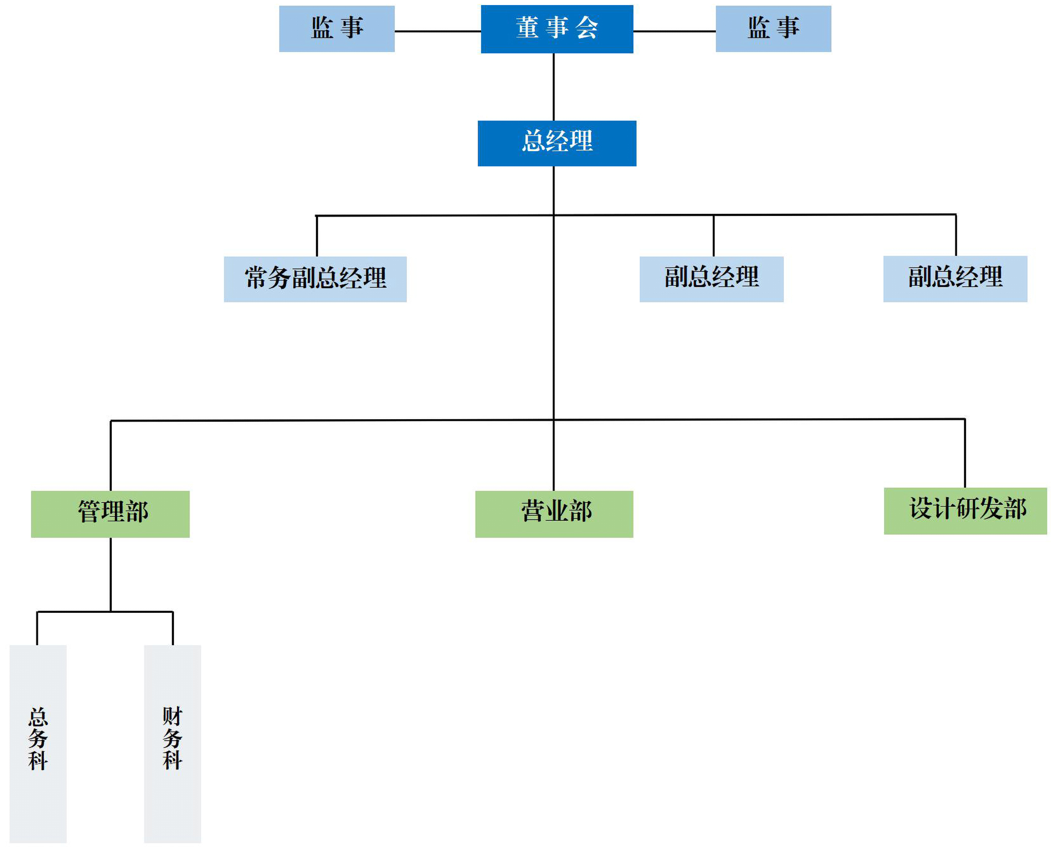 ?公司下設:管理部、財務部、營業部、海外營業部、品質部、采購部、工程部、設計部共8個部門。