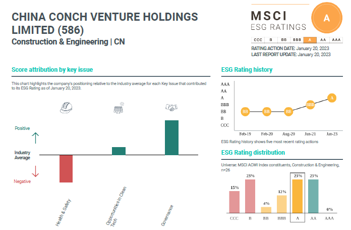 近日,全球最大指數公司明晟MSCI公布了全球最新一期ESG報告評級,海螺創業憑借優異的企業管治水平,公司ESG報告評級由“BBB”躍升至“A”,為全球各大投資機構決策提供重要依據。本次評級進一步體現了公司的投資價值,增強了公司在全球資本市場中的影響力。