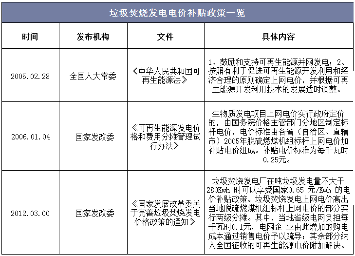 ? ? 2006年我國開始實施《可再生能源法》,法律規定從火電銷售電價中征收可再生能源電價附加作為可再生能源發展基金用以補貼,風電、光伏、垃圾焚燒發電等都在補貼范圍。2012年,《國家發展改革委關于完善垃圾焚燒發電價格政策的通知》提出,垃圾焚燒發電廠在噸垃圾上網電量不大于280度時可以享受國家0.65元/度的電價補貼政策,高出當地脫硫燃煤機組標桿上網電價的部分實行兩級分攤。其中,當地省級電網負擔每千瓦時0.1元,電網企業由此增加的購電成本通過銷售電價予以疏導,其余部分納入全國征收的可再生能源電價附加解決。