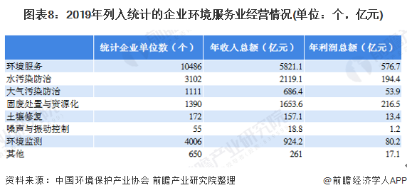 據(jù)環(huán)境保護(hù)產(chǎn)業(yè)協(xié)會數(shù)據(jù),涉及企業(yè)樣本包括參加全國環(huán)保產(chǎn)業(yè)重點(diǎn)企業(yè)基本情況調(diào)查的3535家企業(yè)、參加全國環(huán)境服務(wù)業(yè)財(cái)務(wù)統(tǒng)計(jì)的8943家企業(yè),剔除重復(fù)樣本,共計(jì)11003家企業(yè)。上述企業(yè)2019年?duì)I業(yè)收入總額7597.5億元、營業(yè)利潤總額689.9億元,其中,環(huán)保業(yè)務(wù)營業(yè)收入6385.7億元。+