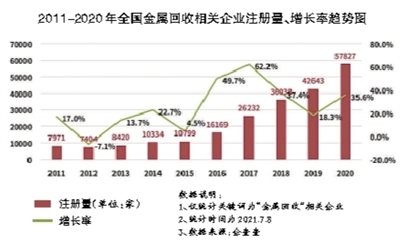 數據顯示,目前我國現存“金屬回收”相關企業共32.2萬家。2020年是企業注冊量的高峰期,新增5.7萬家;今年前六月新增4.6萬家,同比增長118%。