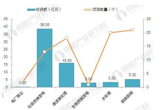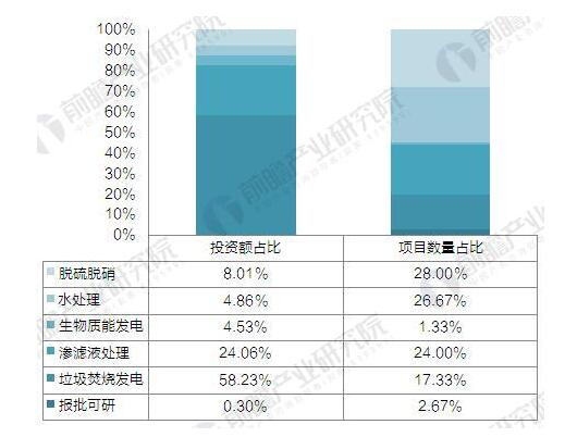 ? ? 從項目細分領域來看,脫硝脫硫領域的建設項目最多,共有21個在建、擬建項目,占比達28%;垃圾焚燒發(fā)電領域共有13個項目,但投資額達到38.55億元,占投資額的比重為58.23%;滲濾液處理領域的項目數(shù)量共18個,僅次于脫硝脫硫和水處理,投資額為15.93億元。