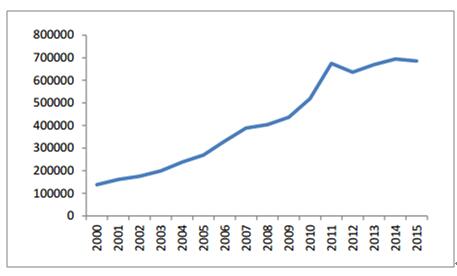 2000-2015年工業廢氣排放總量(億立方米)