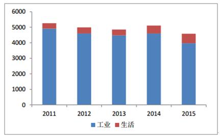 2011-2015年工業與生活端廢氣排放(億立方米)