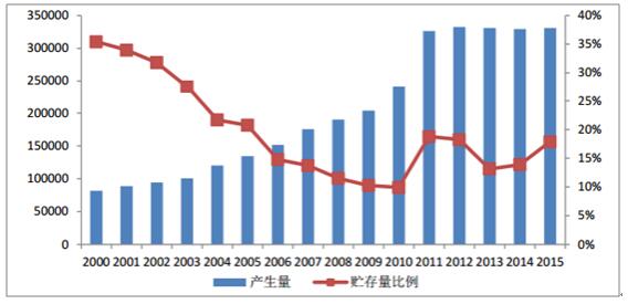 2000-2015年工業固廢產生量及貯存量比例(萬噸,%)