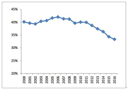 2000-2016年工業占GDP比重