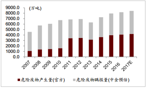 ? ? 危廢生產量逐年上升,從 2011 年的 3,431.2 萬噸上升到 2015 年的 3,976.1 萬噸,復合增長率約為 3%。但是需要注意的是《統計公報》采用的是企業申報的方法,因此我們認為這個數據遠遠低于真實情況。最直接的對比就是《第一次全國污染源普查公告》中統計的 2007 年工業危廢產生量為4,573.69 萬噸,遠遠高于當年環保部公布的 1,079 萬噸。 2011 年,環保部大幅修改統計口徑,擴大申報范圍,當年《統計公報》披露危廢產生量 3,431 萬噸相比 2010 年 1,586萬噸上升一倍有余。即使在這樣的情況下,該數據依舊遠遠小于《普查公告》數據。我們根據工業增加值的增長來估計實際危廢產生量, 2007 年工業增加值約為 11.16 萬億。2016 年工業增加值上升到 24.79 萬億,復合增長率約為 9.26%。如果考慮到企業減排和循環利用的因素,我們適當調低危廢產生增速, 2016 年我們預期的危廢實際產生量也達到了 8100 萬噸。行業內普遍預期實際產生量應該在 1 億噸/年。